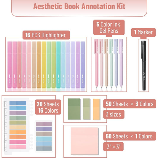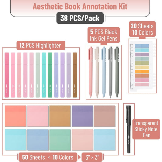 Aesthetic Book Annotation Kit, 38 Pcs, Highlighters, Gel Pens & Sticky Notes Set