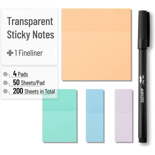 Pastel Transparent Sticky Notes Set, 200 Sheets with Fine-Tip Pen – Clear Bible Notes, Planner Tabs & Book Annotations