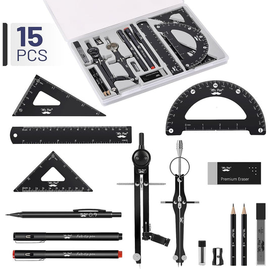 Professional Geometry Set, 15pcs, Black Geometry Kit for Artists and Students, Geometry Set, Metal Rulers and Compasses, Drawing Tools, Drafting Supplies, Drafting Set, Drafting Tools and Kit