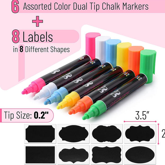 Chalk Markers, 6 Pack, Dual Tip, Vibrant Colors, Includes 8 Reusable Labels, Liquid Chalk Pens for Blackboard & Glass