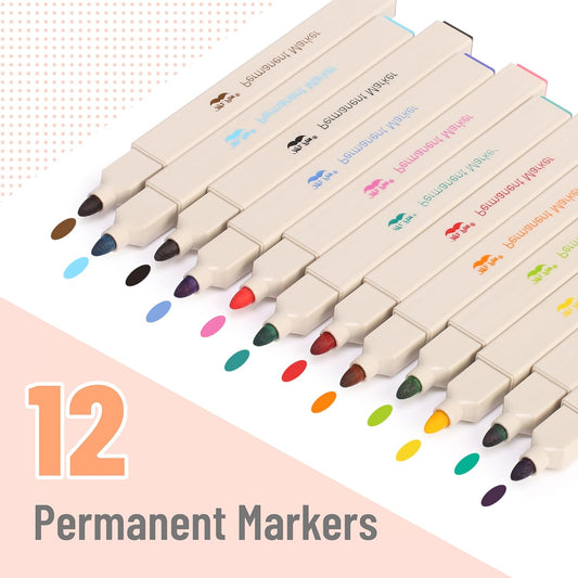 Aesthetic Permanent Markers, 12 Pack, Fine Point, Assorted Colors, Square Barrel, Long-Lasting Colored Markers