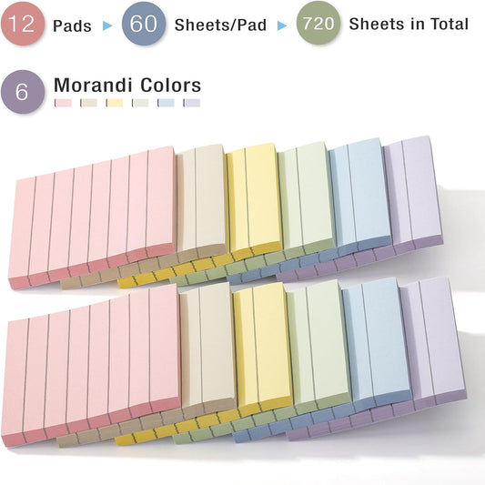 Lined Sticky Notes 3"x3", 12 Pads, 720 Sheets, Morandi Colors, Self-Stick Note Pads for To-Do Lists & Reminders