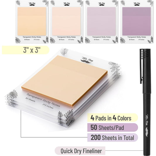 Transparent Sticky Notes 3"x3", 200 Sheets, Pastel Colors, 4 Pads with Quick-Dry Pen