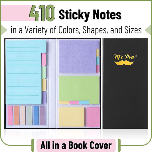 Sticky Note Set, 410 Pack – Pastel Ruled, Dotted, Blank Notes with Index Tabs in Portable Notebook Cover