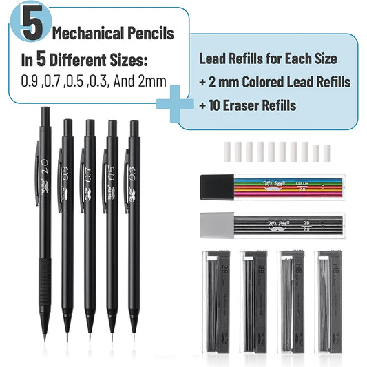 Metal Mechanical Pencil Set with Lead & Eraser Refills, 5 Sizes: 0.3, 0.5, 0.7, 0.9, 2.0 mm