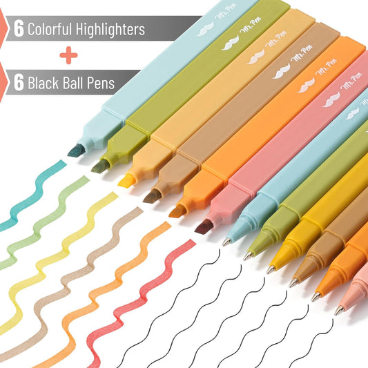 Aesthetic Highlighters & Ballpoint Pens, 12 Pack, Black Ink, No-Bleed, Soft Colors, Chisel Tip + Ballpoint Pens, Journaling & Study Set