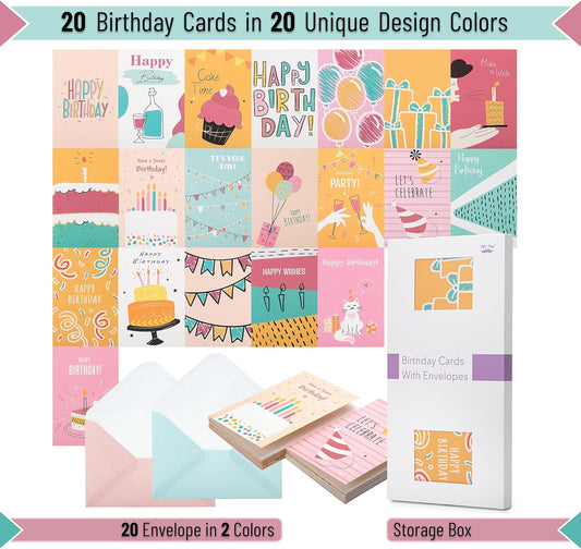 Assorted Birthday Cards with Envelopes, 20 Pack, 4 x 6 Inches, Birthday Cards Pack, Bulk Birthday Cards, Birthday Card Pack, Box of Birthday Cards, Greeting Cards Birthday
