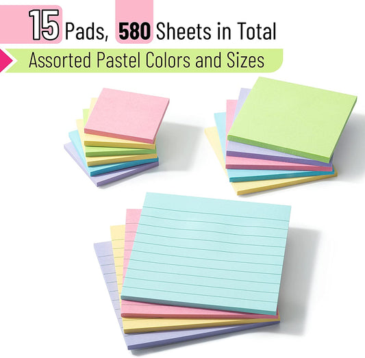 Sticky Notes Set, Assorted Sizes, 15 Pc, Pastel Colors, Sticky Notes, Sticky Note Pads, Sticky Notes Variety, Sticky Notes Pack, Sticky Note Set, Sticky Pads, Colored Sticky Notes