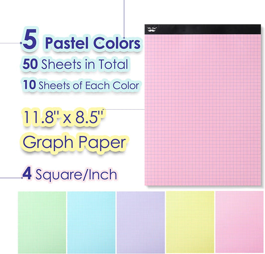 Pastel Graph Paper, 1 Pad, 11"x8.5", 4x4 (4 Squares Per Inch), Pastel Colors, 50 Sheets, Grid Paper, Graphing Paper, Graph Paper Pad, Grid Paper Pad, Colored Graph Paper