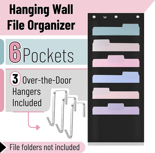 Hanging Wall File Organizer, 6 Pocket, Black, 3 Overdoor Hangers Included, Over The Door File Organizer, Wall Folder Organizer