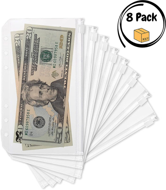 A6 Binder Pockets, 8 Pack, 6 Holes, A6 Binder Inserts, A6 Binder Cash Envelopes, Clear Cash Envelopes, Zipper Envelopes, A6 Binder Envelopes, Clear Zipper Pouches for Binders, A6 Zipper Pouch