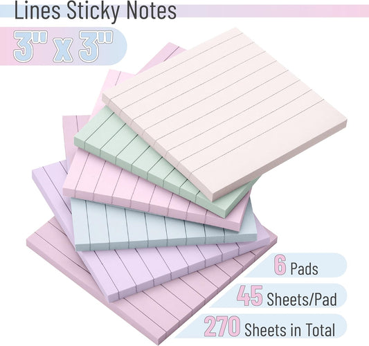 Lined Sticky Notes 3x3, 6 Pads, 45 Sheet/Pads, Pastel Colors, Sticky Notes with Lines, Sticky Note Pads, Sticky Pads, Sticky Notes Lined, Colorful Sticky Notes, Mr Pen Sticky Notes