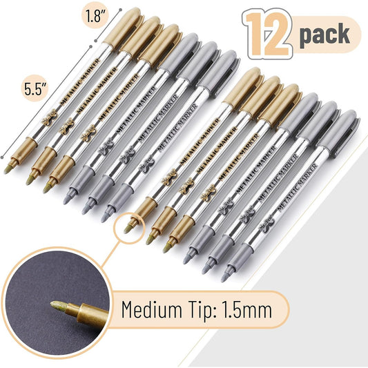 Metallic Paint Markers, 12 Pack, Silver and Gold, Silver Paint Marker, Gold Ink Pen, Silver Pen, Silver Markers Permanent Metallic, Silver Ink Pen, Gold Metallic Marker, Gold Marker, Gold Pen