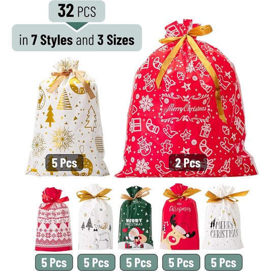 Christmas Drawstring Gift Bags, 32 pcs, Christmas Gift Bags Assorted Sizes, Christmas Bags with Drawstring, Christmas Gift Bags Bulk, Drawstring Christmas Gift Bags Drawstring, Gift Wrap Bags