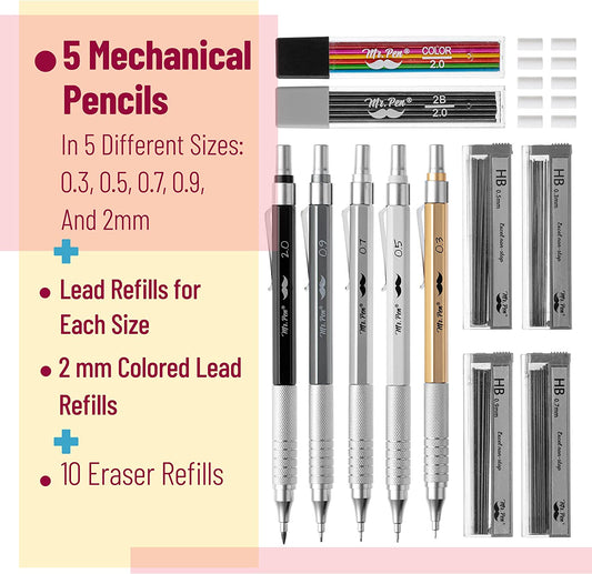 Metal Mechanical Pencil Set with Leads and Eraser Refills, 5 Sizes - 0.3, 0.5, 0.7, 0.9 and 2 Millimeters, Sketching/ Drafting Pencil
