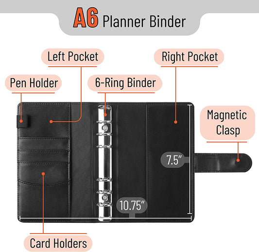 Planner Binders,A6, Black, Leather Notebook Cover, Composition Notebook Cover Refillable, Wallet Binder, Planner Binder 6 Ring, Leather Ring Binder, Refillable Notebook Binder