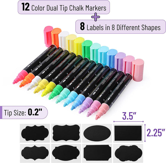 Chalk Markers, 12 Pack, Assorted Colors, 8 Labels, Chalkboard Markers, Liquid Chalk Markers for Chalkboard, Chalk Pens, Chalk Marker, Glass Markers, Liquid Chalk Markers Erasable