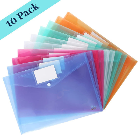 Plastic Envelopes, 10 Pack, A4, Letter Size, Assorted Colors, Plastic Envelopes with Snap Closure, Plastic Envelopes for Documents, Document Envelope, Poly Envelope, File Envelopes