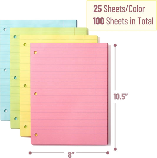 Colored Loose Leaf Paper Wide Ruled, 100 Sheets, 8” x 10.5”, 3- Hole Punched, Notebook Paper, Lined Paper, Binder Paper, Writing Paper, Filler Paper, Wide Ruled Notebook Paper