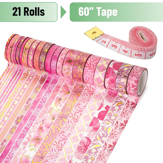 Mr. Pen- Washi Tape Set, 21 Rolls, Floral Pink, Decorative Tape with Measure Tape