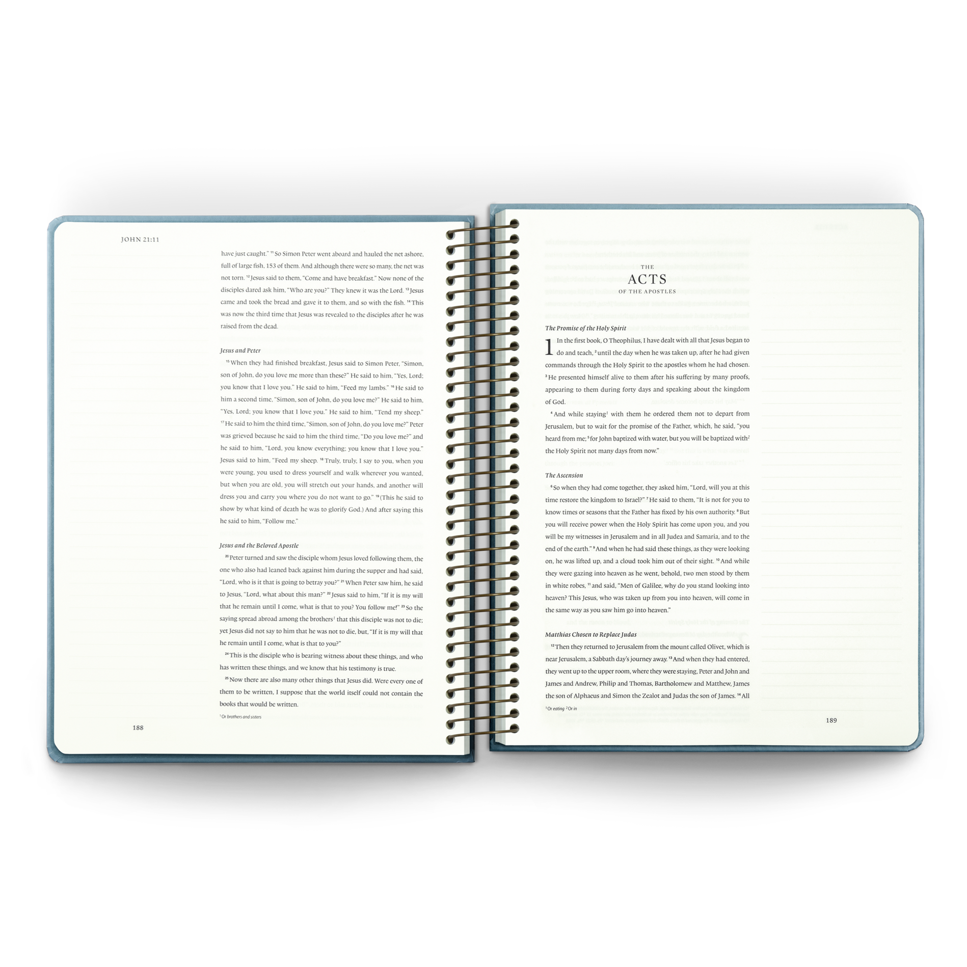 The ESV New Testament Spiral-Bound Journaling Bible was created from the ground up to facilitate in-depth note-taking. It features an inviting, easy-to-read layout with generous space for notes. The spiral-bound format lies flat for comfortable reading and writing. Designed to encourage deeper interaction with Scripture, this journaling edition is ideal for recording prayers and reflections.