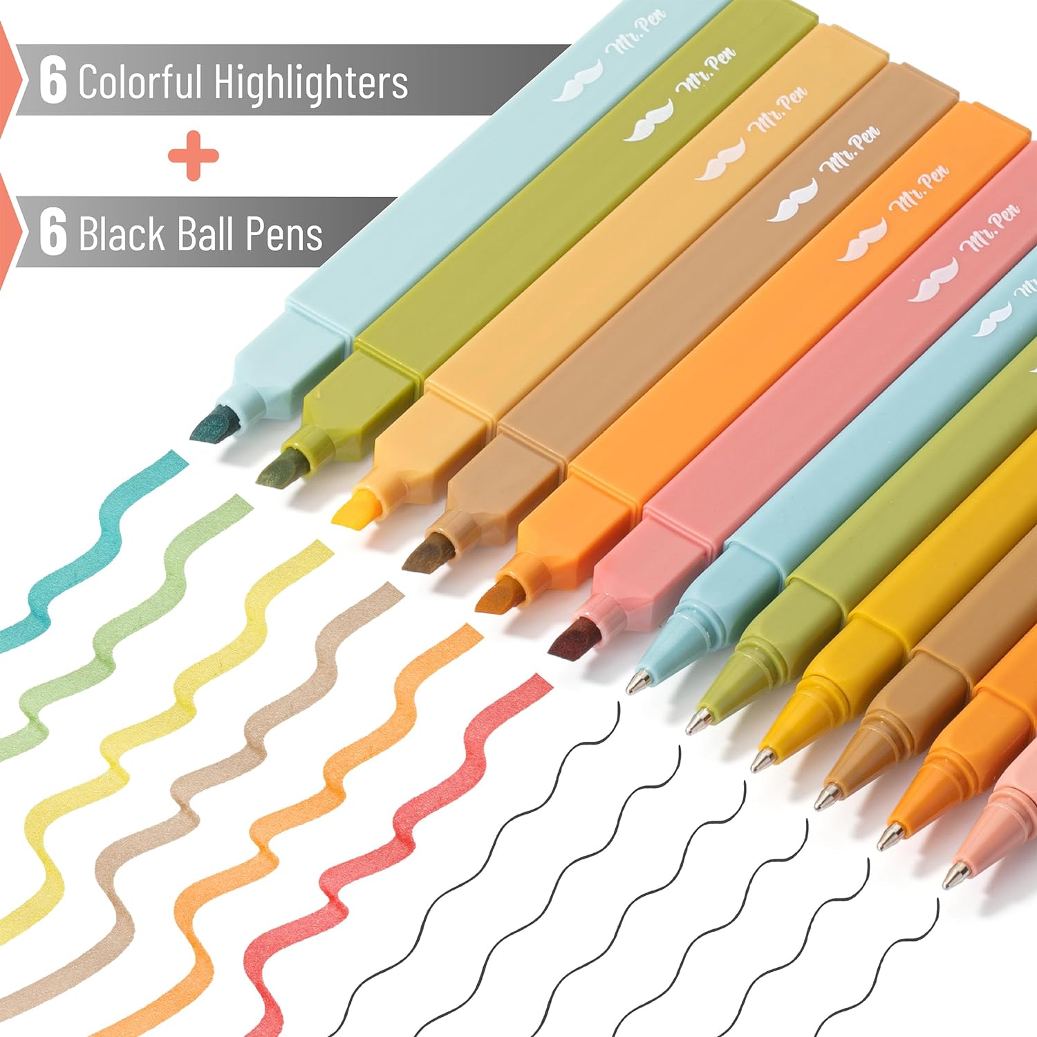 - Package includes 6 highlighters in a delightful assortment of non-neon, soft, and beautiful colors and 6 ballpoint pens in assorted black ink, offering a versatile and coordinated set for all your writing and highlighting needs.