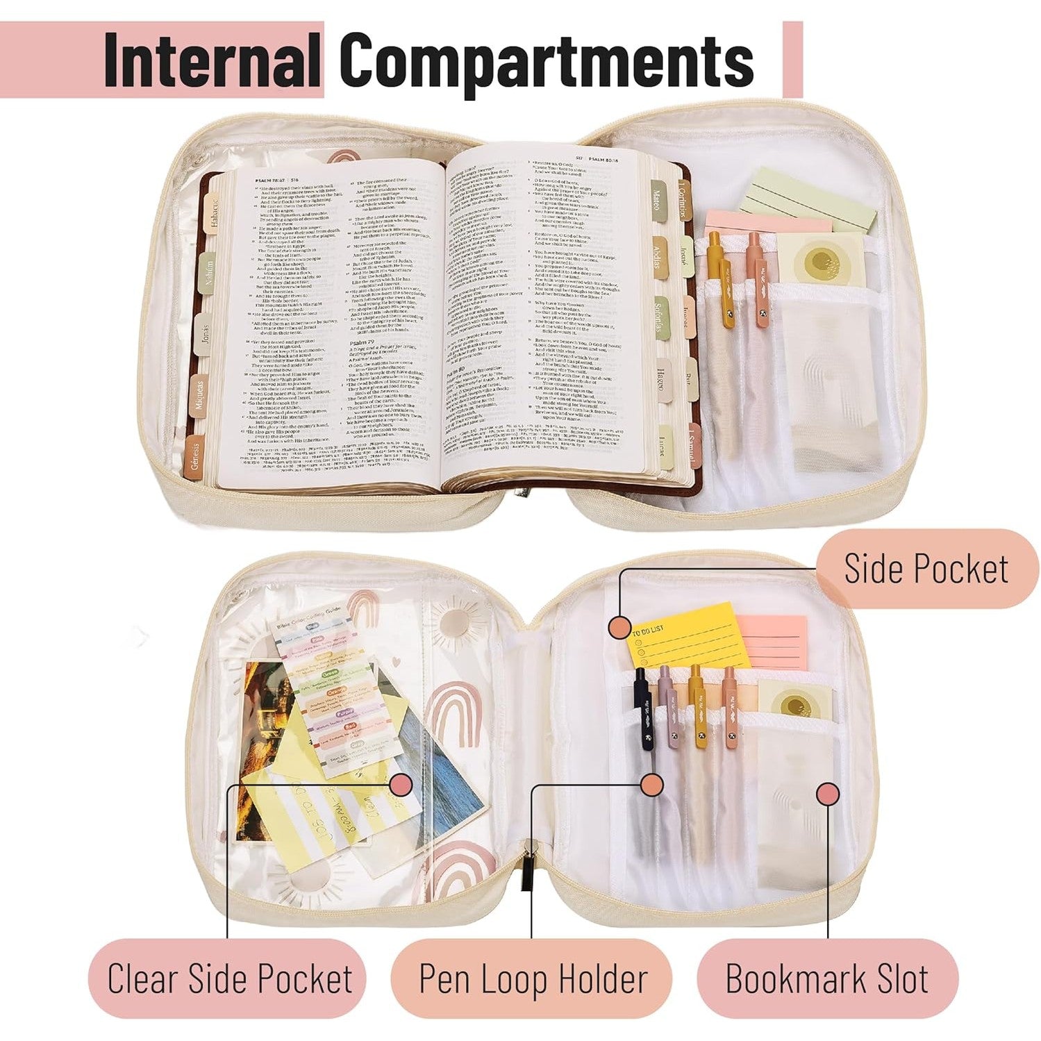 - The spacious interior includes multiple pockets for storing pens, highlighters, notes, and other study materials, making it easy to keep everything you need for Bible study in one place.