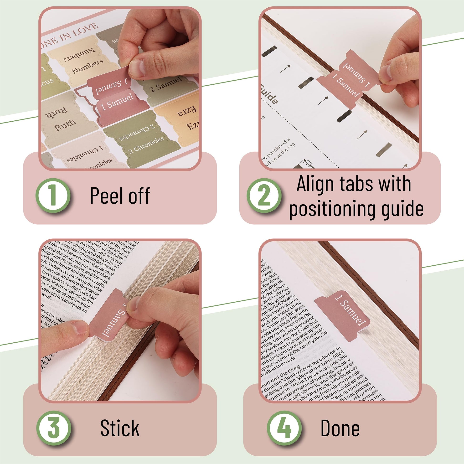 - Each tab is made for easy application, with a self-adhesive design that sticks firmly to Bible pages, reducing the risk of damage to the delicate paper.