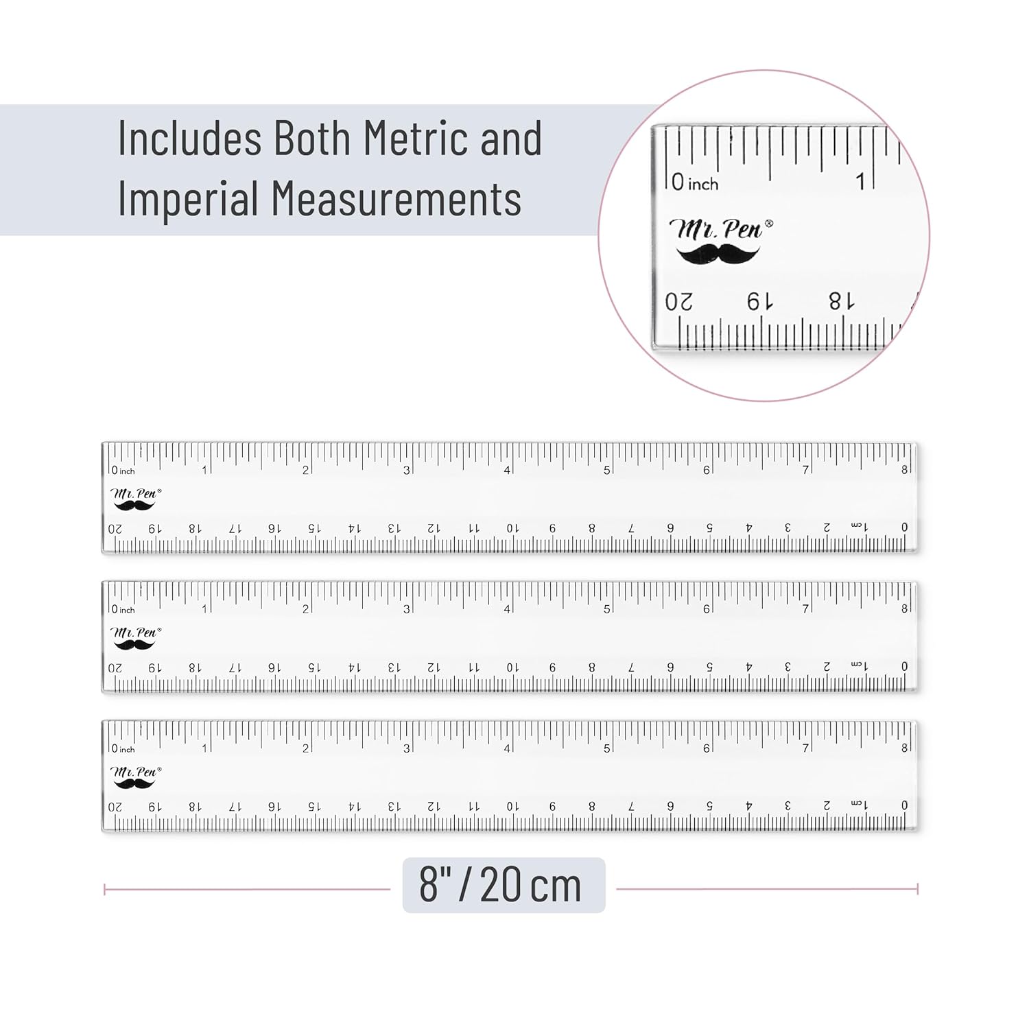 Plastic Ruler 8 Inch, 3 Pack, Clear, Metric & Imperial