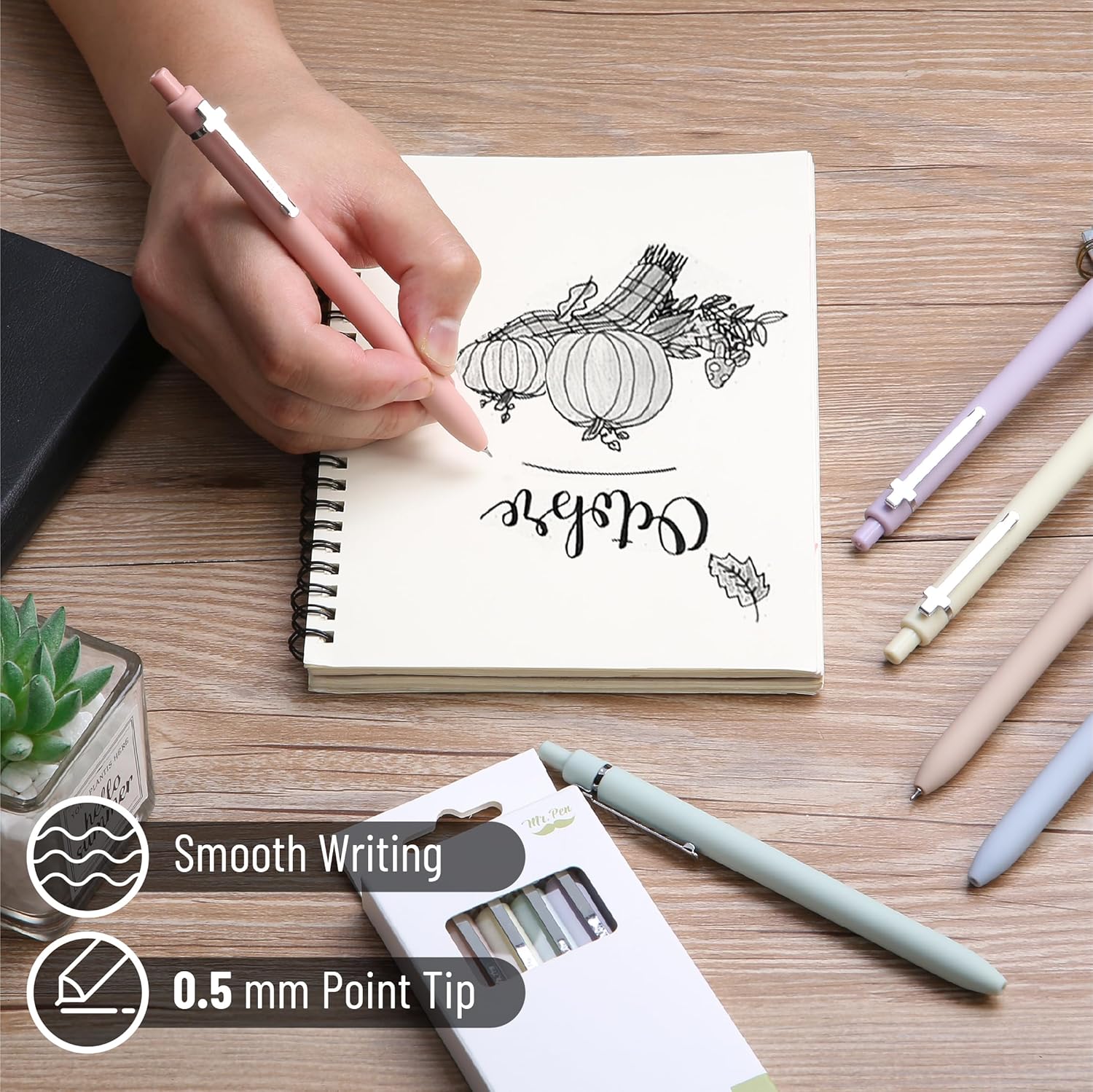 - Mr. Pen retractable gel pens come in a set of 6, each featuring a sleek and minimalistic design with a vibrant assortment of soft colors.