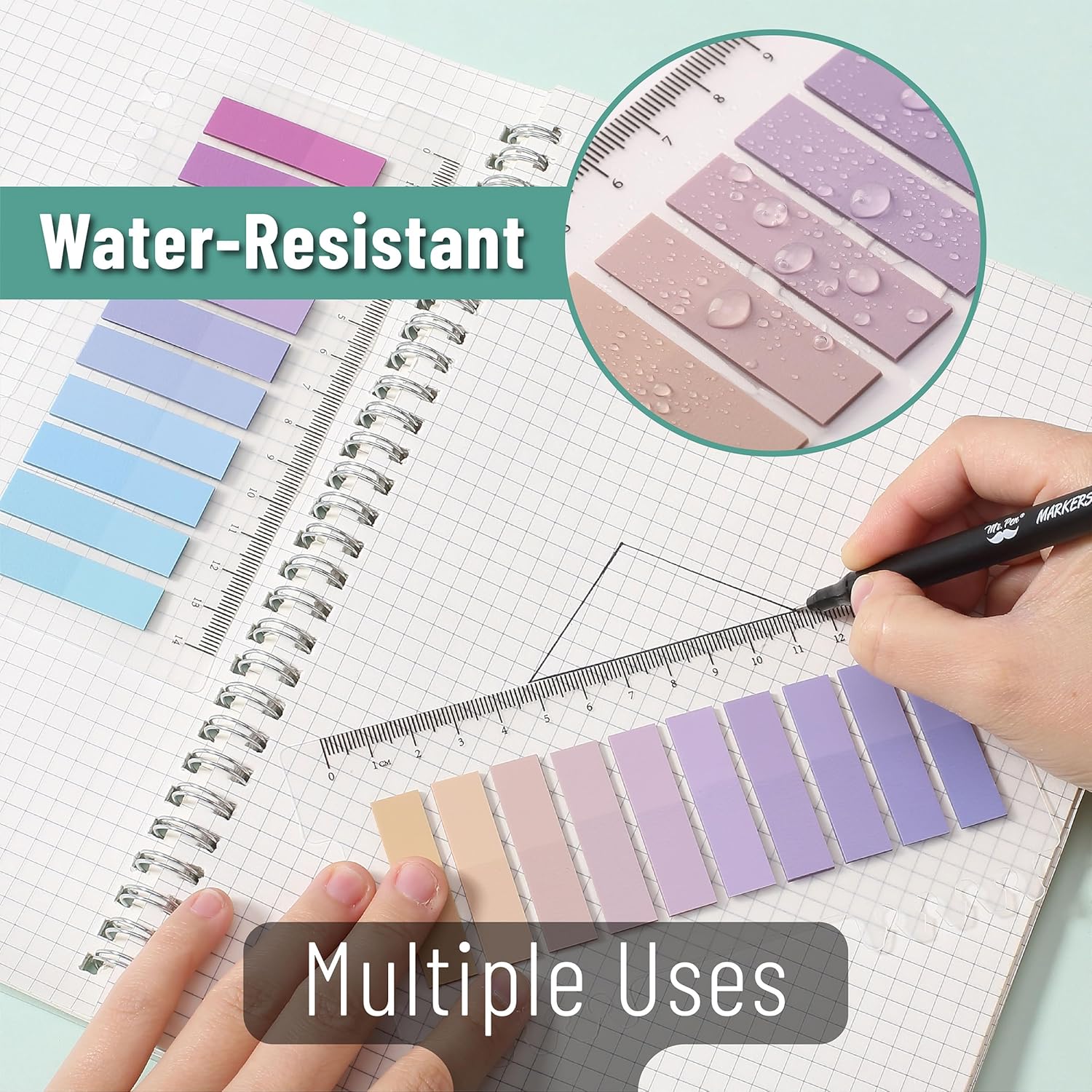 - Mr. Pen index tabs are made of top quality PET material and special adhesive, waterproof, non-toxic, and have no odor. Using most pens, markers, and highlighters, you can get smooth and clear writing on the tab.