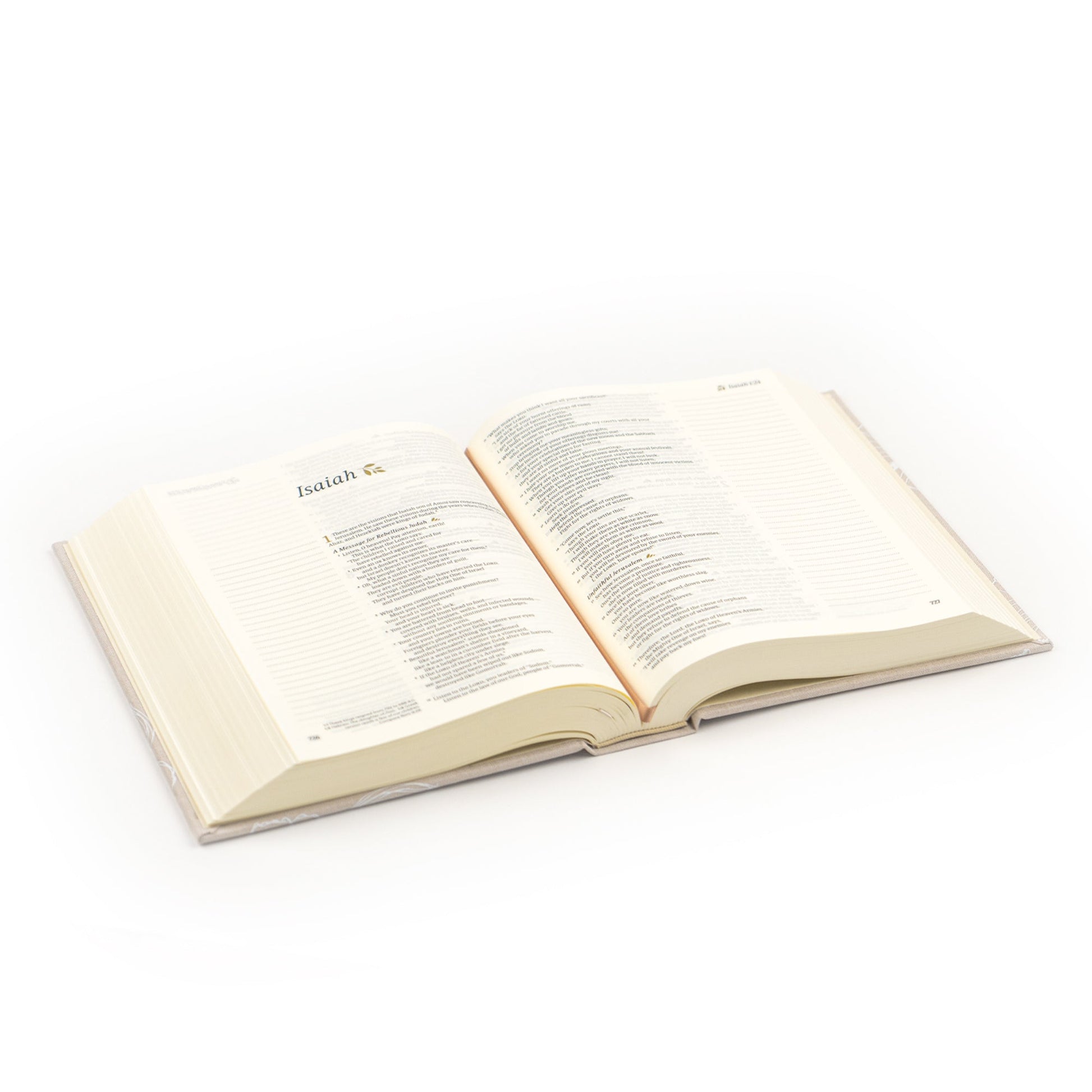 Cordova, Alaska is a breathtaking city situated on Prince William Sound in the Gulf of Alaska. It is surrounded by naturally protected waters and beautiful, untamed wilderness. The sprawling open spaces are surrounded by mountains and have a temperate rainforest climate, making them rich with vibrant foliage and flowers. The muted, light colors of this Bible mix a little icy winter with beautiful spring florals.